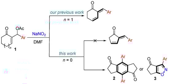 In the course of our ongoing interest in chemical transformations of Morita–Baylis–Hillman (MBH) adducts, we have reported the NaNO2-catalyzed synthesis of 2-methylene-3-cyclohexenones from cyclohexenone-MBH acetates []. As a continuation of this work, we wish to establish herein for the first time a substituent-controlled regioselective synthesis of structurally unprecedented tetrahydro-s-indacene 1,5-diones 2 and cyclopentanone-fused isoxazoles 3 via the NaNO2-catalyzed/involved transformation of cyclopentenone-MBH acetates (1, n = 0) (Scheme 1).