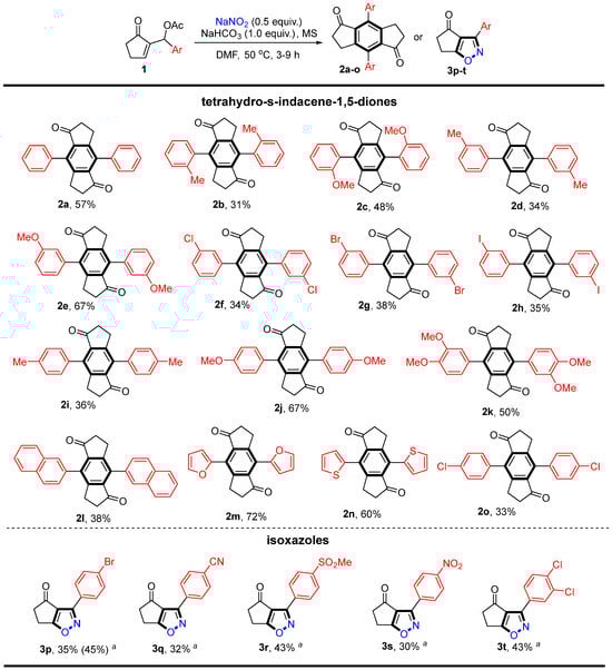 Substrate scope of tetrahydro-s-indacene-1,5-diones/isoxazoles. Reaction conditions: 1 (0.4 mmol), NaNO2 (13.8 mg, 0.2 mmol), NaHCO3 (33.6 mg, 0.4 mmol), and 4Å molecular sieve (MS, 50 mg) were stirred in DMF (4 mL) at 50 °C; isolated yield. a NaNO2 (27.6 mg, 0.4 mmol) was used.