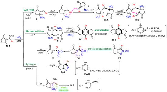 Based on the experimental outcomes and earlier reports on using NaNO2 as a nucleophilic mediator [,], we proposed a plausible reaction mechanism. As indicated in Scheme 3, the reactions can follow two paths depending on the character of the substituent on the aryl moiety of MBH acetates 1. The reaction goes through path 1 when the aryl moiety is decorated with EDG(s), m-halogen, or p-Cl. In these cases, NO2− triggers an SN2′-type nucleophilic substitution at the β position of cyclopentenone moiety initially, yielding SN2′ adduct I after the liberation of AcO−. Next, Michael addition occurs between deprotonated II and neutral I, generating III-A after protonation. Subsequently, III-B, serving as deprotonated species of III-A, undergoes intramolecular Michael addition to produce III-C, featuring a six-membered ring. AcO− then neutralizes the neighboring proton of the nitro group, triggering the negative charge-driven twofold elimination of NO2− and completing the catalytic cycle. Finally, the so-formed cyclohexadiene intermediate IV aromatizes to s-indacene derivatives 2a-o via spontaneous aerobic oxidation.
