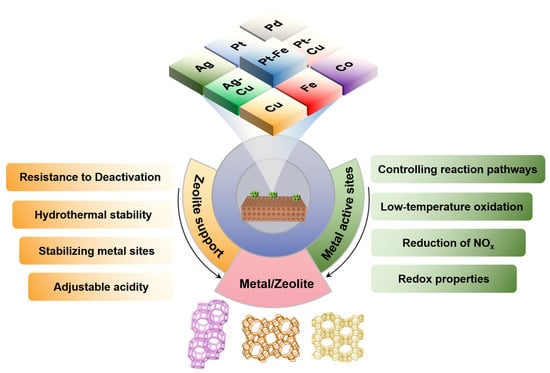 Beyond structural and acidic properties, the interaction between the zeolite framework and active metal species determines the catalyst’s overall efficiency. The unique ability of zeolites to host a range of metal species, including noble metals such as Pt and Ag and non-noble metals such as Cu and Fe, enhances their catalytic versatility [19,20]. As shown in Figure 1, the zeolite support enhances catalyst stability by providing resistance to deactivation, improving hydrothermal stability, stabilizing metal sites, and offering adjustable acidity. The metal active sites facilitate key catalytic functions, including controlling reaction pathways, enabling low-temperature oxidation, enhancing NOx reduction, and improving redox properties. The synergy between the zeolite framework and metal species optimizes NH3 conversion and selectivity, making metal/zeolite catalysts highly effective for NH3-SCO applications.