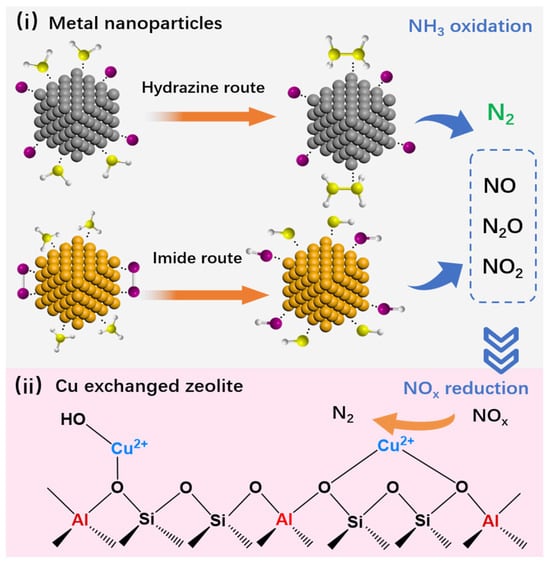 Reaction pathways over bimetallic zeolite catalysts for NH3-SCO: NH3 oxidation on metal nanoparticles (i) and NOx reduction on Cu-exchanged zeolites (ii) (Source: The Authors).
