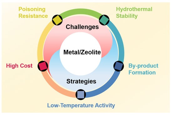 Zeolite-based NH3-SCO catalysts face several critical challenges that limit their efficiency and practical applicability, as depicted in Figure 3. These include deactivation caused by poisoning, reduced hydrothermal stability under harsh conditions, high production costs, undesirable NOx formation, and suboptimal performance at low temperatures. Addressing these limitations requires a combination of innovative materials design, advanced synthesis techniques, and operational strategies to enhance catalyst durability, activity, and cost-effectiveness. This section examines these challenges in detail and discusses potential strategies to overcome them, paving the way for the development of next-generation NH3-SCO catalysts.