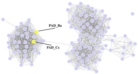 Sequence similarity network (SSN) of phenolic acid decarboxylase protein homologues. Yellow indicates the node where the query PAD_Ba and PAD_Cs are located.