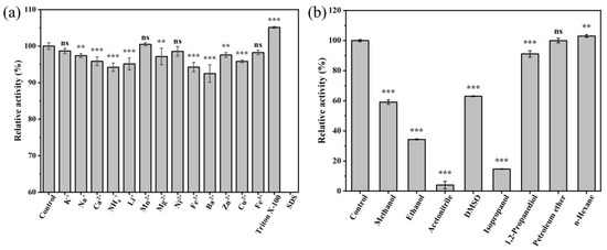 Effect of various metal ions, surfactants (a), and organic reagents (b) on PAD_Cs activity. The statistical significance of the final results was analyzed using Student’s t-test, ns: not statistically, ** p < 0.01, *** p < 0.001.