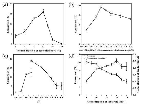 Effects of the volume fraction of acetonitrile (a), the ratio of the mass of lyophilized cells to the concentration of substrate (b), the pH during the rehydration of lyophilized cells (c) and the concentration of substrate (d) on the β-carboxylation conversion rate.