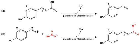 Decarboxylation (a) and β-carboxylation (b) catalyzed by phenolic acid decarboxylase. The red part shows where bicarbonate is involved in the carboxylation reaction as a source of CO2.