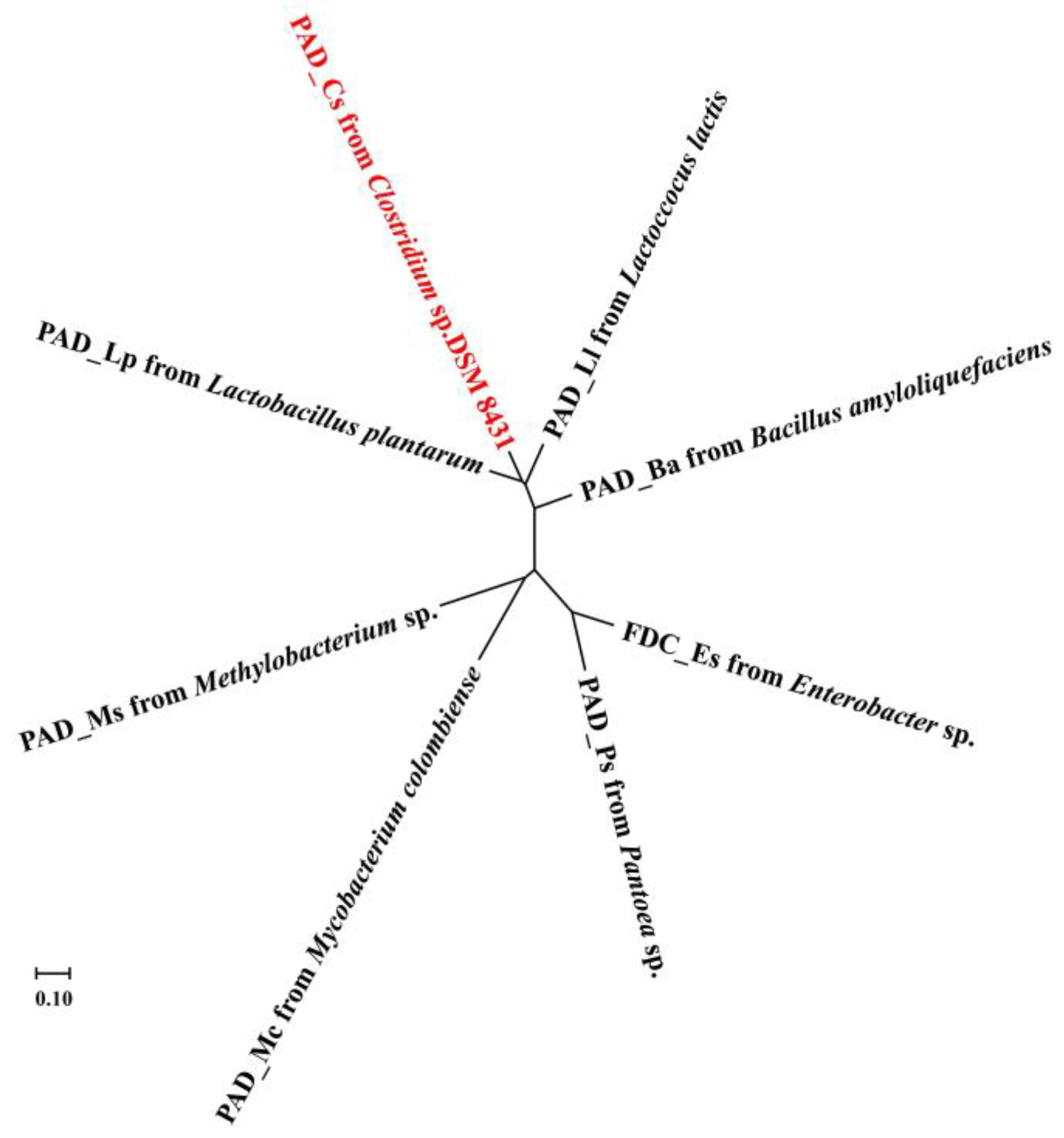 Phylogenetic tree of PAD_Cs and other reported phenolic acid decarboxylases that can achieve reversible decarboxylation. The red part is the enzyme PAD_Cs reported in this work.