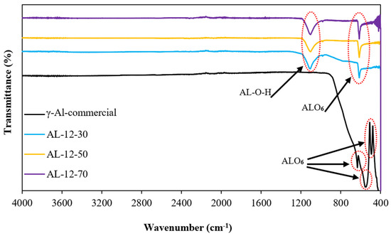 The FTIR graph also revealed a strong concentration of Al-OH at a peak of 614 cm−1 for the synthesized samples AL-12-30, AL-12-50, and AL-12-70. In contrast, Figure 1 shows that the γ-Al-commercial exhibited bands at approximately 492 cm−1, 544 cm−1, and 633 cm−1, which correspond to the Al-O stretching mode, indicating a single homogeneous phase of aluminum hydroxide [29]. Both the synthesized and commercial samples shared similar peaks, with bands ranging from 492 to 633 cm−1, signifying the stretching vibration of AlO-6. The distinct difference observed at 1110 cm−1 was attributed to the symmetric bending of the Al-O-H bond, likely due to the presence of two different phases in the synthesized samples, whereas the commercial form exhibited a single phase [29,30]. The FTIR spectra of γ-alumina showed a broad pattern ranging from 613 to 980 cm−1, with no noticeable sharp peaks. This broad extended band suggested the presence of an amorphous structure or structural disordering. This pattern represents the complex crystallographic structure of γ-Al2O3 [31,32]. The bands seen at 1100 to 1110 cm−1 correspond to the symmetric Al-O-H bonds vibration [33].