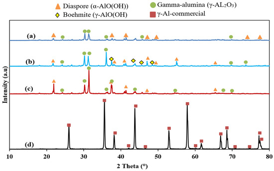 Figure 2 shows the presence of different alumina phases in the synthesized products. Boehmite (γ-AlO(OH)) is a mineral found in bauxite, an aluminum ore [34]. According to previous studies, boehmite, is a metastable phase during the transformation of alumina which and exists in a dimorphic relationship with diaspore [14]. Diaspores often exhibit structural collapse following hydrogen transfers and water extraction, which facilitates their rapid transformation into gamma alumina (γ-Al2O3). This transition is considered the fastest way to convert diaspore into alpha-alumina (α-Al2O3) [35].