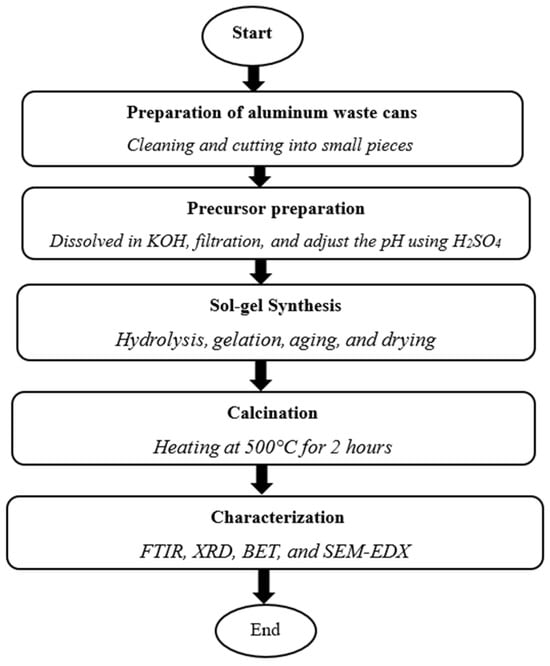Aluminum can waste was collected from the Mercu Resolution Sdn Bhd dump site in Sungai Ikan, Terengganu, Malaysia. KOH (≥85%), H2SO4 (≥98%), and γ-Al-commercial (Catalog no. 934054; gamma phase, Gamma-alumina, Gamma-aluminum (III) oxide nano-powder; CAS Number: 1344-28-1) were supplied from Sigma-Aldrich (M) Sdn Bhd (Petaling Jaya, Malaysia). Deionized water, used as a solvent for many processes, was obtained from the University laboratory at Universiti Malaysia Pahang—Sultan Abdullah (UMPSA, Kuantan, Malaysia).