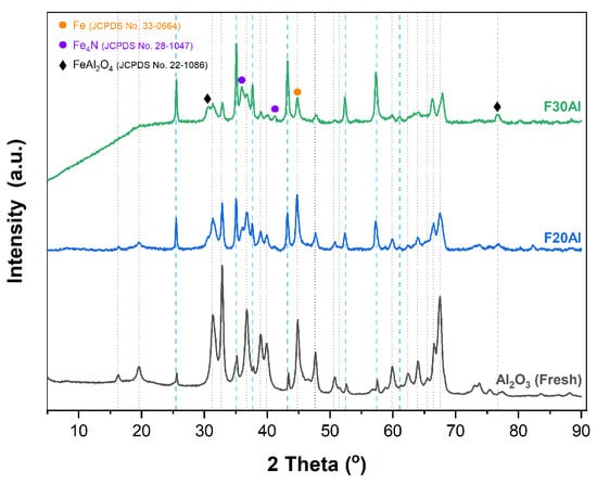 The physicochemical properties of iron-based supported catalysts including their specific surface areas, pore sizes, and pore volumes are presented in Table 1. The specific surface area of the fresh alumina support was measured at 73.65 m2/g, while pore volume and pore size were found to be 33.3 cm3/g and 17.7 nm, respectively. Iron sequential doping over alumina indicated a decrease in specific surface area from 73.65 to 55.47 m2/g after 10 wt% iron was doped (F10Al). A further increase in iron loading to 20 (F20Al) and 30 wt% (F30Al) showed further reduction in specific surface area to 42.92 and 25.91 m2/g, respectively. The decline in specific surface area with iron doping could be attributed to the structure breakdown and pore blockage of the alumina support. The average pore sizes of the iron-doped catalysts remained within 2–50 nm assigned to the mesoporous structure, as defined by IUPAC nomenclature [24]. In Figure 1, the hysteresis area decreased with the addition of iron, indicating deteriorated pore structure stability during adsorption–desorption cycles. A smaller hysteresis area suggested lower pore volume, reducing the capacity of the material for gas, which could be crucial for ammonia decomposition activity. The catalyst samples were also analyzed using X-ray fluorescence (XRF) to measure the targeted iron loadings between 10 and 30 wt%, and it was found that the theoretical values were achieved.