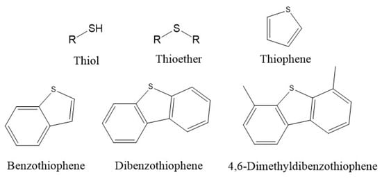 Sulfur is an inherent component of crude oil and is widely present in diesel fuel, primarily in the form of organic sulfur compounds. These compounds mainly include mercaptans, thiophenes (Ts), benzothiophenes (BTs), and dibenzothiophenes (DBTs), as illustrated in Figure 1 [1]. During diesel combustion, sulfur-containing compounds are converted into various harmful emissions, which can be categorized into gaseous, liquid, and solid components, as summarized in Table 1. Among these, sulfur oxides (SOxs) and sulfate particulate matter (SPM) are particularly concerning [2]. SOx gases, upon their release into the atmosphere, can react with water vapor to form acidic solutions, which not only contribute to acid rain but also corrode vehicle components, increasing the risk of mechanical failure and compromising driving safety [3,4]. Moreover, SOx emissions can poison the catalysts in vehicle exhaust treatment systems, significantly reducing the catalyzed efficiency, leading to the exhaust not meeting stringent emission standards, and increasing the contents of COx, NOx, and SOx in the atmosphere. Such emissions exacerbate air pollution and contribute to global environmental challenges, including climate change and urban smog formation. Furthermore, SOx gases can harm the human respiratory system, increasing cancer risk, exacerbating heart disease, and triggering asthma [5,6,7]. Given the significant environmental and health hazards associated with sulfur emissions from diesel combustion, reducing the sulfur content in diesel fuel has become a critical priority.