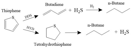 Thiophene is a common cyclic organosulfur compound found in various fossil fuels and is frequently used as a model compound for evaluating catalyst activity in desulfurization studies. Thiophene can be removed via two primary pathways: direct desulfurization and hydrogenation desulfurization [15]. In the DDS pathway, the C–S bond in thiophene is directly cleaved, producing H2S and butadiene, which is subsequently hydrogenated to form n-butane. Alternatively, in the HYD pathway, thiophene undergoes hydrogenation to form tetrahydrothiophene (THT), which is then desulfurized through C–S bond cleavage to yield H2S and n-butane (Figure 2).