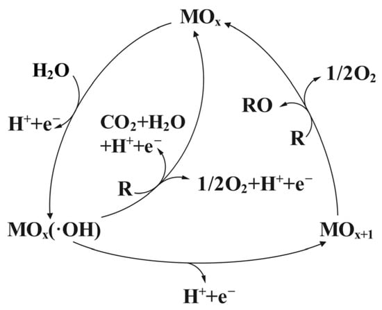 In contrast to electrochemical reduction desulfurization, which generates H2S as a byproduct, electrochemical oxidation desulfurization offers a cleaner alternative. Sulfur-containing compounds are removed via two principal mechanisms: (i) direct electrochemical oxidation, where the sulfur-containing compounds exchange electrons directly with the anode surface without the involvement of other substances; and (ii) indirect electrochemical oxidation, where electron transfer occurs through redox-active intermediates generated at the anode surface, rather than through direct interaction with the electrode [10]. As depicted in Figure 6, low-valent elements are oxidized indirectly to high-valent elements. Sulfur-containing compounds are oxidized to soluble sulfates at the anode, while H2 is precipitated at the cathode. In alkaline media, reactive oxygen species (ROS) generated at the anode, such as hydroxyl radicals (·OH), atomic oxygen (·O), superoxide (O2−), and molecular oxygen (O2), serve as potent oxidizing agents. These active species can oxidize organic sulfides to sulfoxides or sulfones, which subsequently separate from the system. Furthermore, alkaline leaching has been demonstrated to promote desulfurization [113]. The ECDS process in alkaline conditions is illustrated as Equations (1)–(3) below [114].