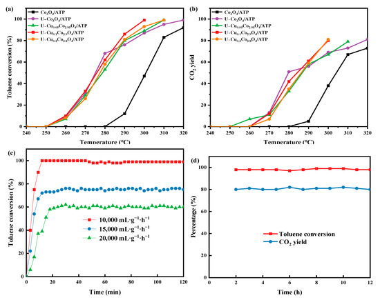 (a) Catalytic oxidation of toluene over Co3O4/ATP, U-Co3O4/ATP, and U-CuxCo3−xO4/ATP; (b) CO2 yield; (c) performance of U-Cu0.1Co2.9O4/ATP in catalytic oxidation of toluene at different WHSVs; (d) stability test of U-Cu0.1Co2.9O4/ATP at 300 °Cover 12 h.