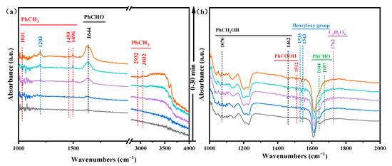 In situ DRIFTS of U-Cu0.1Co2.9O4/ATP: (a) toluene adsorption diagram; (b) toluene degradation diagram at 200 °C.
