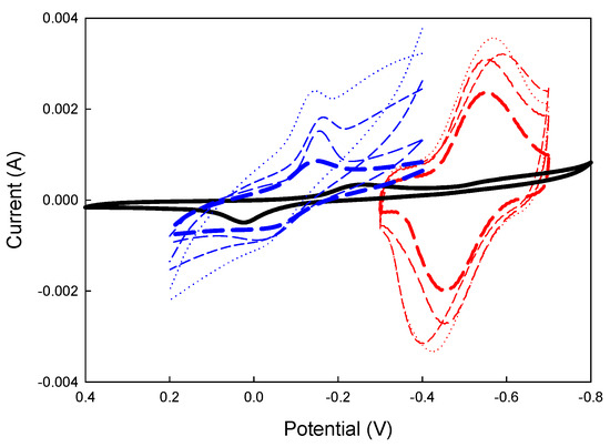 Cyclic voltammetry (CV) of half-cell analysis is a powerful electrochemical technique that studies an electrode’s redox reaction mechanisms with IUPAC convention voltammograms. An anodic (oxidation) current is positive, and a cathodic (reduction) current is negative. This technique involves sweeping the electrode potential from a lower to a higher voltage and back, allowing the system to reach equilibrium. During this process, the electrode’s potential and the resulting current are measured, providing valuable insights into the tested system’s electrochemical behavior, reaction kinetics, and diffusion properties [20,21].