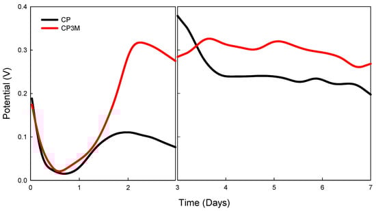 The potential of enzymatic fuel cells for Cp and CPM3 electrodes vs. time on stream. Enzyme concentration = 5 U/10 μL, conductive polymer concentration conditions = 1.5 mM, mediator concentration = 10 mM, buffer solution pH = 5. Anode: PBS as buffer solution (containing a glucose concentration of 10 mM); cathode: ultrapure water. On the third day, the buffer solution (anode side) and ultrapure water (cathode side) were replaced. The electrodes were not immersed in the solution before assembly.
