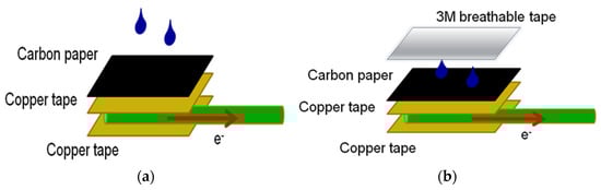 The electrodes were prepared using a copper wire (2 mm diameter) covered with two copper tapes (10 × 10 mm) and carbon paper. Using a pipette, the bioanode and biocathode were created by drop-coating 40 μL of the respective anode and cathode enzyme solutions onto the carbon paper surface. Once the enzyme solution was uniformly coated and completely dried, enzyme immobilization was considered complete. This electrode was referred to as the CP electrode (Figure 7a). A layer of 3M ventilation tape (3M™ Micropore™ Surgical Tape, Minnesota Mining and Manufacturing Company, Taoyuan, Taiwan) was then applied over the CP electrode, creating the CP3M electrode (Figure 7b). The electrode was stored at 4 °C in a refrigerator. A 10 mM PBS glucose solution was introduced into the anode and cathode cells for testing.