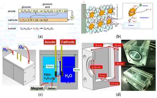 (a) Electrode reaction in the anode and cathode, (b) electron transfer in the conductive polymer and mediator, (c) structure, and (d) geometry of the enzyme-based biofuel cells.