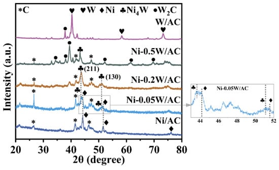 The ICP results of the Ni/AC, Ni-0.05W/AC, Ni-0.2W/AC, Ni-0.5W/AC, and W/AC catalysts are listed in Table 2. The actual W/Ni loading ratios closely match the theoretical values calculated based on the W/Ni atomic ratio, with the corresponding actual atomic ratios being 0, 0.05, 0.22, and 0.52, respectively. W/AC represents the catalyst that contains no nickel.