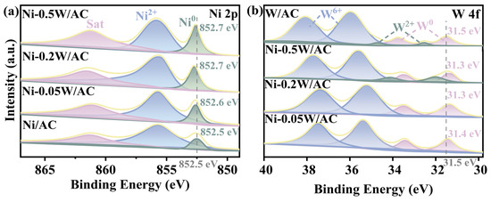 High-resolution XPS spectra of (a) Ni 2p3/2 for the Ni/AC, Ni-0.05W/AC, Ni-0.2W/AC, and Ni-0.5W/AC catalysts. (b) W 4f5/2 and W 4f7/2 for the Ni-0.05W/AC, Ni-0.2W/AC, Ni-0.5W/AC and W/AC catalysts.