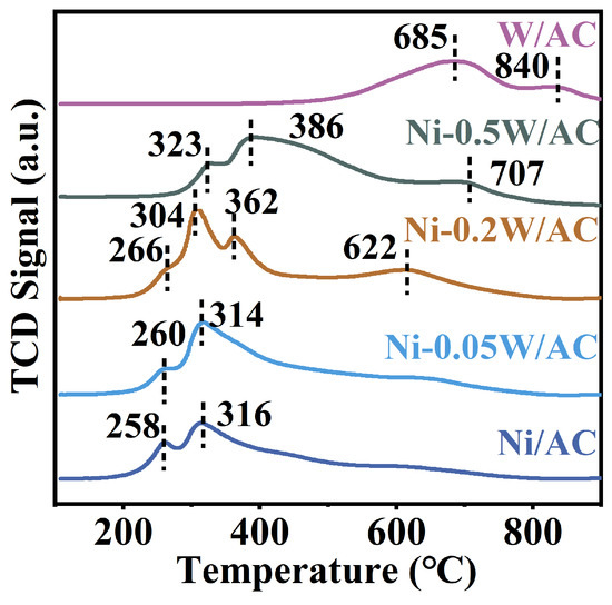 The reduction behaviors and interactions of bimetallic Ni-W within the temperature range of 100–900 °C for the above catalysts were investigated using H2-TPR characterization. Typically, the low-temperature reduction peaks centered at 258 °C and 316 °C can be attributed to NiO reduction (Figure 4) [44]. The high-temperature reduction peak emerges at 685 °C and reaches a maximum at approximately 840 °C, which can be attributed to the reduction in the tungsten oxide in the W/AC catalyst [45]. The observed reduction peaks of Ni-0.05W/AC, Ni-0.2W/AC, and Ni-0.5W/AC catalysts within the same temperature range varied significantly, likely due to different interaction strengths between Ni and W species on each catalyst. These variations led to inconsistent C-C bond cleavage performance. Additionally, the peak shape of the Ni-0.05W/AC catalyst resembles that of the Ni/AC catalyst, indicating that a low W/Ni atomic ratio has no significant impact on the reduction characteristic peak of NiO species. Broad peaks are observed around 386 °C and 707 °C in the Ni-0.5W/AC catalyst, corresponding to the transformation of NiWOx into Ni4W and W2C (Figure 4), respectively [39]. Combined with TEM results, it suggests that under strong reduction conditions, a higher W/Ni atomic ratio promotes the formation of a W2C layer, covering the metal nanoparticles on the surface [46]. The strong peaks at 304 °C, 362 °C, and 622 °C for the Ni-0.2W/AC catalyst (Figure 4), along with its highest hydrogen consumption of 186 μmol (Table 2), clearly demonstrate the enhanced reduction and dispersion of the active metal species [47]. Therefore, an optimal W/Ni atomic ratio facilitates the reduction and further dispersion of active metal species on AC at lower temperatures. Herein, from the characterization results, it can be concluded that a lower W loading leads to a weaker bimetallic interaction, while a higher W loading results in the coverage of active sites. However, when the W/Ni ratio reaches 0.2, the bimetallic interaction is maximized, significantly enhancing the uniform dispersion of active species on the catalyst surface.