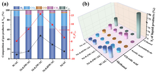 The red and black lines in Figure 5a correspond to C1/C2+ and , respectively, both following a trend of initially increasing and then decreasing with rising W loading, peaking at those on Ni-0.2W/AC catalyst. The CCgas and XEG data in Table 3 indicated a strong correlation between hydrogen production and the conversion mechanism of ethylene glycol. The characterization results also revealed a correlation between the particle size and dispersion of active metallic particles in the APR of ethylene glycol and the proportion of single-carbon products. The strong interaction between bimetallic Ni and W species synergistically promoted the dispersion and the reduction in active Ni4W nanoparticles on the Ni-0.2W/AC catalyst. These enhanced catalytic properties resulted in small and uniformly distributed active sites on the surface of the catalyst, which significantly increased the contact between reaction stock, dehydrogenation intermediates, and the active sites, thereby promoting feedstock conversion and achieving a high carbon conversion (XEG = 80.08%). This interaction also promoted both the decomposition of ethylene glycol and the forward WGS reaction, enhancing the efficiency of conversion to gas products. This process depended on the C-C bond cleavage ability, reflecting the improved performance of the Ni-0.2W/AC catalyst. Furthermore, the increased hydrogen yield demonstrated that C-C bond cleavage contributed directly to hydrogen production.