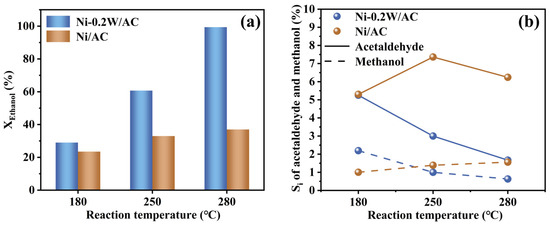 To explore ethanol conversion trends with temperature under hydrothermal conditions of APR and further verify the hypothesis (I), APR simulations of low-concentration ethanol solutions were conducted at sequentially increasing temperatures: 180 °C, 250 °C, and 280 °C, with the Ni/AC catalyst serving as the control. Extending the reaction time to 10 h ensured equilibrium and other experimental conditions were identical to those of ethylene glycol APR. Results revealed that ethanol APR primarily yielded acetaldehyde and methanol, indicating that ethanol conversion under similar conditions follows the conversion mechanisms of acetaldehyde and methanol. Performance evaluation (Figure 6a,b) showed that the Ni-0.2W/AC catalyst exhibited higher conversion, especially at elevated temperatures, compared to the Ni/AC catalyst. Previous studies reported that ethanol can be completely converted at 500 °C by the Ni-W catalysts during a steam reforming reaction [55]. Similarly, in this study, the Ni-0.2W/AC catalyst achieved efficient ethanol conversion at 280 °C, suggesting that the Ni-W bimetallic synergy enhanced the conversion of low-carbon alcohols (e.g., ethanol, ethylene glycol) under APR conditions. Thus, ethanol appears more readily convertible on the Ni-0.2W/AC catalyst at higher temperatures.