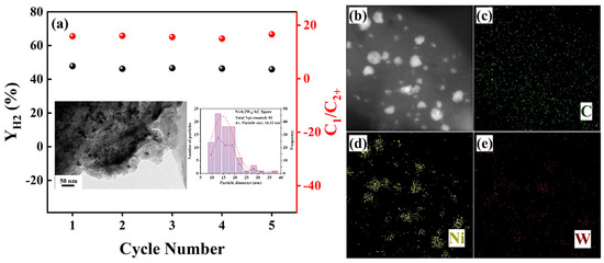 The catalyst stability of Ni-0.2W/AC was tested for five cycles. As shown in Figure 7a, the and C1/C2+ of the Ni-0.2W/AC catalyst showed a small amount of variation in the five cycling reactions, demonstrating good catalyst stability. TEM and EDS characterization tests (Figure 7b) were performed on the spent catalyst after five cycles. It showed that the spent Ni-0.2W/AC catalyst exhibited slight agglomeration of metal nanoparticles, but the metal distribution shown in the EDS plots in Figure 7b–e indicated that there was no significant loss of metals. The generation of acetic acid during the APR reaction of ethylene glycol leads to metal leaching [44,51]. For the Ni-0.2W/AC catalyst in this work, a slight decrease in catalytic performance can be attributed to the strong Ni-W interaction and the inhibition of the acetic acid intermediate. As confirmed by XPS and XRD characterizations, the formation of the Ni4W alloy enhances the bimetallic interaction through the confinement effect, which stabilizes the Ni metal and improves its resistance to leaching by acidic liquid phase products, such as acetic acid, under APR conditions. This stability is evidenced by only minimal agglomeration and abundant Ni metal distributed on the support, as observed in TEM images after five cycles (Figure 7a).