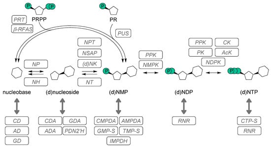 Enzymes involved in the nucleotide salvage pathway. AD: adenine deaminase, ADA: adenosine deaminase, AcK: acetate kinase, AMPDA: AMP deaminase, ß-RFAS: 4-(D-ribofuranosyl)aminobenzene synthases, CD: cytosine deaminase, CDA: cytidine deaminase, CK: creatine kinase, CMPDA: CMP deaminase, CTP-S: CTP synthetase, (d)NK: (deoxy)nucleoside kinase, GD: guanine deaminase, GDA: guanosine deaminase, GMP-S: GMP synthase, IMPDH: IMP dehydrogenase, NDPK: NDP kinase, NH: nucleoside hydrolase, NMPK: NMP kinase, NP: nucleoside phosphorylase, NPT: nucleoside phosphotransferase, NSAP: nonspecific acid phosphatase, NT: 5′-nucleotidase, PDN2′H: pyrimidine nucleoside 2′-hydroxylase; PK: pyruvate kinase, PR: ribose-5′-phosphate, PPK: polyphosphate kinase, PRT: phosphoribosyl transferase, PRPP: 5-phospho-D-ribosyl-α-1-pyrophosphate, PUS: pseudouridylate synthase; RNR: ribonucleotide reductase, TMP-S: thymidylate synthase. The double-headed arrow (↔) indicates conversions between nucleotides with the same phosphorylation stage (e.g., AMP to IMP, 5′-NDP to 5′-dNDP, or UTP to CTP).