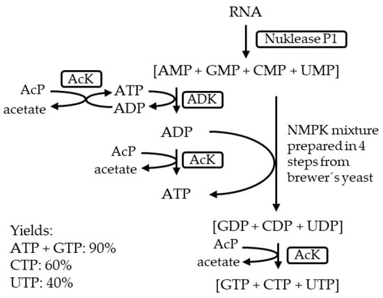 Synthesis of 5′-NTPs from RNA. The figure was adapted from Haynie and Whitesides (1990) [24]. ADK: adenosine kinase, AcK: acetate kinase, AcP: acetyl phosphate.