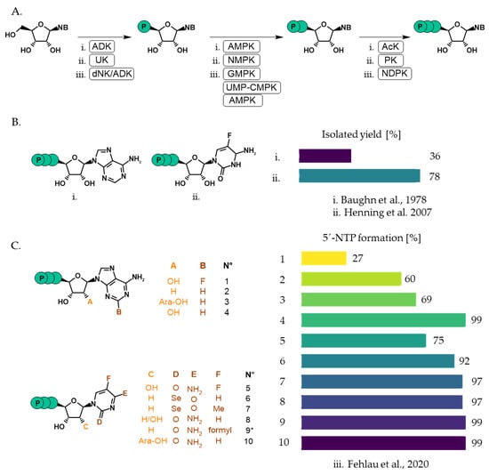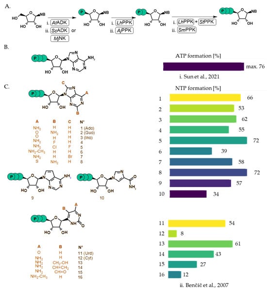 Starting with nucleosides, phosphorylation by an NK is first performed, followed by the PPK-mediated conversion of 5′-NMP to 5′-NTP (Figure 7A). Sun et al. successfully synthesized ATP using this approach (Figure 7B) [97], while Bencic et al. investigated a range of compounds, including all natural 5′-NTPs and base-modified variants, achieving yields from 8% to 72% (Figure 7B) [79].