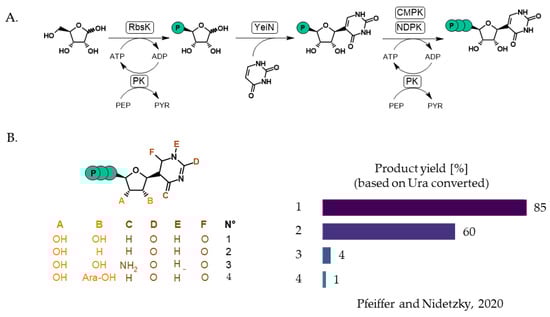Biocatalytic synthesis of 5′-riphosphorylated C-nucleotides. (A) Reaction scheme. (B) Reported product yields [94]. RbsK: ribokinase, YeiN: C-glycosidase, CMPK: CMP kinase, NDPK: NDP kinase, PK: pyruvate kinase, PEP: phosphoenolpyruvate, PYR: pyruvate.