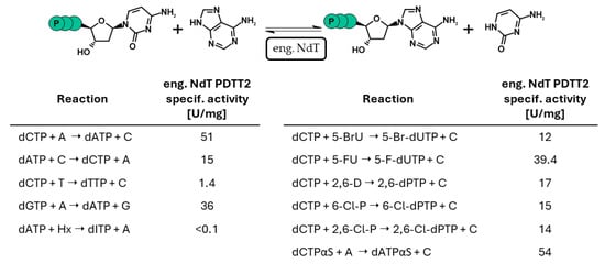 A different approach for 5′-dNTP synthesis involves a mutated nucleoside 2′-deoxyribosyltransferase (NdT), engineered to transfer nucleobases not only between deoxynucleosides but also between 5´-dNMPs, 5´-dNDPs and 5´-dNTPs [104]. This enzyme was used to produce base-modified purine and pyrimidine 5′-dNTPs from their respective nucleobases and CTP (Figure 8). However, this method is limited to N-glycosidic 5´-dNTPs and has so far resulted in low conversion rates.