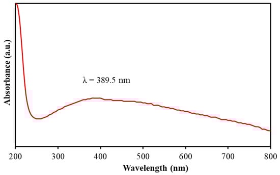 The UV-Vis spectroscopy analysis of durian husk extract-mediated CuO NPs exhibited a broad absorption band in the range of 200–800 nm, with an absorption feature centered at 389.50 nm. (Figure 1). This peak corresponds to the intrinsic band-to-band transitions in CuO nanoparticles, confirming their successful synthesis. This broad absorption profile suggests polydispersity in particle size and their surface plasmon resonance (SPR) interactions with phytochemicals from the durian husk extract, which influence the optical properties of the CuO nanoparticles.