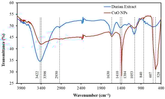 FTIR spectroscopy identified key functional groups responsible for the reduction and stabilization of CuO NPs. For the durian husk extract, a broad absorption band observed at 3422 cm−1 corresponds to the stretching vibrations of O–H groups, indicating the presence of hydroxyl groups from phenolic compounds and water molecules. In the spectrum of CuO NPs, this peak shifts to 3398 cm−1, suggesting the involvement of hydroxyl groups in the reduction and stabilization of copper ions during nanoparticle synthesis.