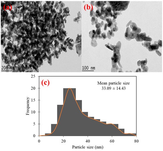 HR-TEM micrographs of durian husk-mediated synthesized CuO NPs at (a) ×17,500 magnification and (b) ×39,000 magnifications, respectively and (c) is the histogram of particle size distribution.
