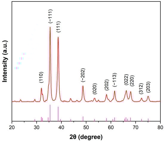 X-ray diffraction (XRD) analysis (Figure 6) revealed distinct diffraction peaks at 2θ values of 32.44°, 35.65°, 38.70°, 48.64°, and 53.45°, corresponding to the (110), (002), (111), (202), and (020) planes, respectively. These indices are in excellent agreement with the standard diffraction pattern for monoclinic CuO (JCPDS Card No. 801916), confirming the successful synthesis of CuO NPs with a monoclinic crystalline structure [40]. The characteristic peaks at 31.92, 35.45, 38.69, 48.75, 53.41, 58.26, 61.52, 66.12, 67.95, 72.36, and 75.06 degree positions can be observed and indexed to the (hkl) planes of CuO, such as (110), (−111), (111), (−202), (020), (202), (−113), (022), (220), (312), and (203). The sharpness and intensity of the observed peaks indicate a high degree of crystallinity, which can be attributed to the effective capping and stabilizing action of phytochemicals present in the durian extract. The average crystallite size was calculated using the Debye-Scherrer equation [41]: