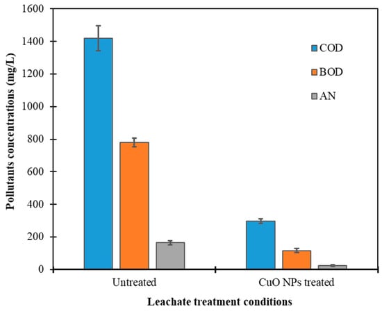 Municipal solid waste (MSW) landfill leachate with an initial COD of 1420 mg/L was treated with CuO NPs under UV light. The COD was reduced by 79% after 3 h, reaching 298 mg/L, demonstrating the nanoparticles’ effectiveness in degrading organic pollutants (Figure 8). This substantial reduction in COD highlights the strong oxidative potential of CuO NPs, likely driven by the generation of reactive oxygen species (ROS) under UV light.