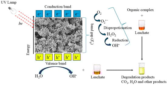 The exponential growth of urbanization and industrialization has resulted in a significant increase in global solid waste generation. Landfills, commonly used for waste disposal, produce leachate as a by-product of waste degradation and percolation of rainwater through waste layers [1,2]. Landfill leachate is a complex and highly contaminated liquid containing a mixture of organic and inorganic pollutants, including heavy metals, ammonia, nitrates, and persistent organic compounds. If left untreated, leachate can infiltrate groundwater or surface water, posing severe environmental and public health risks. Conventional methods for leachate treatment, such as biological treatment, coagulation, and chemical oxidation, often struggle with treating highly toxic and recalcitrant pollutants [3,4]. As a result, there is an urgent need to develop alternative, environmentally friendly treatment approaches [5,6]. In this context, photocatalysis has emerged as an efficient and sustainable alternative for treating landfill leachate, leveraging advanced oxidation processes to degrade and mineralize harmful contaminants.