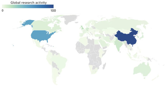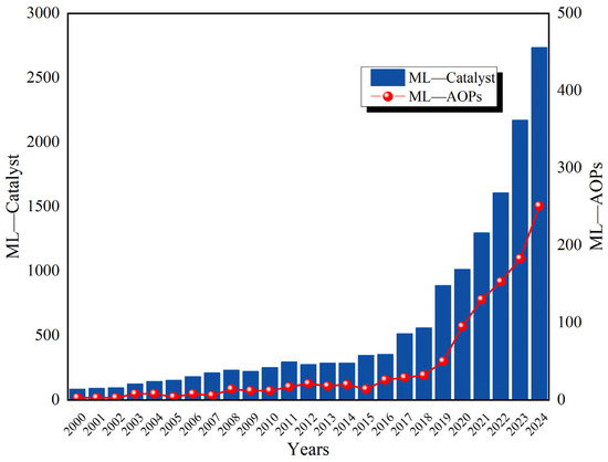 We searched for nearly two decades of machine learning-assisted catalyst development for advanced oxidation processes. Upon conducting a comprehensive literature review, a collection of studies pertaining to the development of machine learning-assisted catalysts for advanced oxidation processes, spanning from 2000 to 2024, was procured from the Web of Science Core Collection. The most prolific publications, countries, and journals involved in the machine learning-assisted catalyst development for advanced oxidation processes were identified. At the same time, a world map was provided, which shows the global research activity in ML catalysts for AOPs. The results are shown in Figure 1 and Figure 2. From Figure 1, it can be seen that, since 2018, the research on machine learning-assisted catalyst development, especially in the process of AOPs, has exploded exponentially. Figure 2 shows that global research activity is concentrated in China, the United States, and European industrial powerhouses, with Asia dominating.