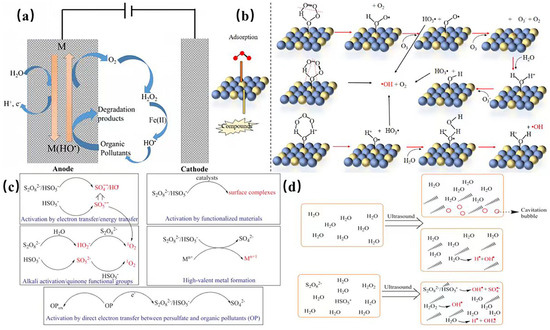 Elucidation of advanced oxidation process mechanisms. (a) Hydroxyl radicals are generated as intermediates in electrocatalytic oxidation processes. (b) Catalytic mechanism of ozone. (c) Possible activation pathways of persulfate. (d) Reactive species generated under ultrasonic irradiation [30].