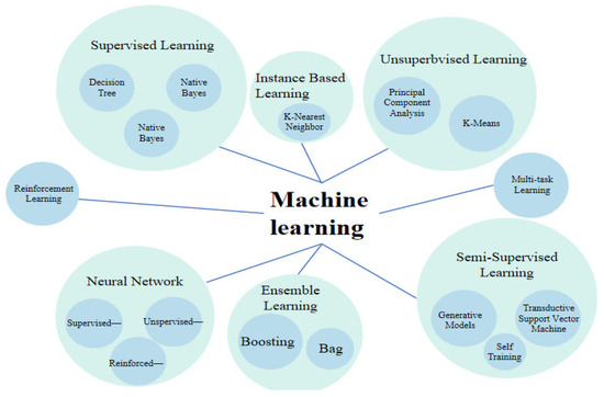 ML is able to guide machines in efficiently processing data. At times, the information extracted from the data is difficult for us to comprehend. This is where machine learning plays a role. With the increasing richness of available datasets, the demand for machine learning continues to rise. Currently, many enterprises place great importance on the role of machine learning in data extraction. The purpose of machine learning is to learn from the data [51,52]. The main types of machine learning models are shown in Figure 4.