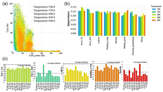 ML and physical quantities derived from the periodic table explore the descriptors of product selectivity in the oxidative coupling of methane (OCM) reaction. (a) C2 selectivity versus CH4 conversion of the oxidative coupling of methane obtained by high-throughput experiments. The color represents the temperature. (b) Importance analysis by random forest classification. (c) Average density, electronegativity, electron affinity, and first and second ionization energies of predicted high C2 selectivity catalysts. In each plot, a horizontal line represents the descriptor average over all data for comparison. ion-e_1st = first ionization energy; ion-e_2nd = second ionization energy; e-aff-ev = electron affinity; Pauling_e-neg = Pauling electronegativity; Group = periodic table group. Reproduced with permission [88].