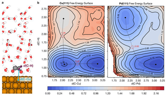 Based on MLaMD, the cleavage dynamics enhancement simulation diagram of the ethylene glycol C-H bond on Cu(111) and Pd(111). (a) Illustrate an atomic-level computational model of ethylene glycol adsorption on Cu(111), with a clear representation of the reagent; ethylene glycol and the surface are represented by spheres; whereas, water molecules are represented by lines. The two collective variables, d(C–H) and d(C–Cu), are marked. Color code for atoms: brown—Cu, grey—C, red—O, white—H. (b) 2D free energy surface for the C–H bond breaking of ethylene glycol over Cu(111) and Pd(111). Red dotted circles mark transition states and red text denotes their energies. Solid black circles mark minima [91].