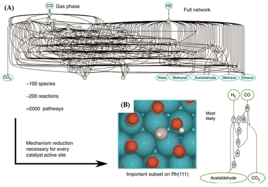 The optimization framework of Gaussian process regression (GPR) was applied to study the reaction of syngas (CO and H2) on Rh (111) catalyst under experimental operating conditions (573 K and 1 atm). (A) Comprehensive reaction network encompasses syngas transformation into multiple products, including CO2, H2O, methanol (CH3OH), acetaldehyde (CH3CHO), methane (CH4), and ethanol (CH3CH2OH). Surface intermediates are restricted to species containing ≤2 carbon and ≤2 oxygen atoms. (B) Machine learning-driven reduced reaction network for syngas reactivity identifies acetaldehyde and CO2 as dominant products, consistent with experimental validation on Rh(111). This simplification is achieved through the iterative GPR-guided pruning of kinetically irrelevant pathways, prioritizing thermodynamically favorable and experimentally observed routes. Oxygen atom = red sphere; rhodium atom = green sphere; carbon atom = grey sphere; hydrogen atom = white sphere [96].
