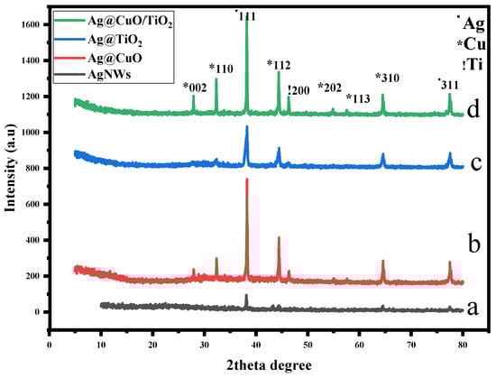 XRD spectra of (a) Ag NWs, (b) Ag@CuO, (c) Ag@TiO2, and (d) Ag@CuO/TiO2 core@hybridized shell.