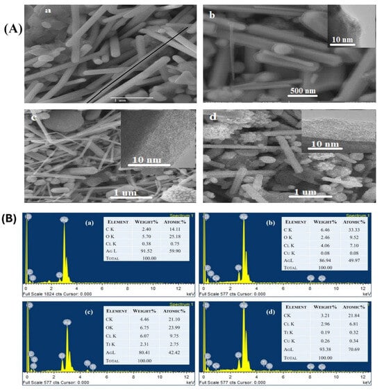 The SEM images, supported by the inset images of TEM, are presented in Figure 2A(a–d), showing the morphology and surface topography of the pure Ag NWs, Ag@CuO, Ag@TiO2 nanocables, and Ag@CuO/TiO2 nanocables with a hybridized shell of both metal oxides. The inset images, which were focused on to analyze the coating thicknesses of CuO, TiO2, and mix of these two metal oxides, are presented in Figure 2A(b–d). In Figure 2A(a), the Ag NWs were produced as a dominant product having diameters between 70 and 80 nm and lengths in the µm scale, consistent with the reported data [24]. The surface of the Ag NWs was smooth, with the appearance of a truncated pentagonal texture. During coating by the pure metal oxides and their hybridized form, the diameter and length of the NWs were affected due to the interference in the mass transfer of the Ag nuclei over growing Ag NWs. The smooth surface of the NWs was coated with an ultra-thin sheath of CuO, reducing the truncated pentagonal texture and converting the whole surface as a round. This information is well-disclosed in Figure 2A(b). Figure 2A(b) also depicts the rod-like structure smoothly coated with a CuO ultra-thin nanosheath. The thickness of the nanosheath is expressed in the inset of same figure, which is related to the TEM observation and clearly differentiated the core from the surface coating. The thickness of the surface coating was analyzed from 5 to 8 nm. In Figure 2A(c), the SEM micrograph shows the Ag@TiO2 nanostructures, with the Ag NWs having an average diameter of 60–70 nm. This figure further exposes the remarkable structures of ultra-thin wires, which in the presence of TiO2 decreased the reduction of the Ag cation and maintained the slow deposition, leading to longer cables with a small diameter [25]. Herein, the coating developed a rough surface. It further shows the cubical- and cylindrical-shaped structures along with agglomerated fine particles that are supposed to be TiO2. However, the inset of the same figure, which is again a TEM image, showed a uniform surface coating with a thickness around 10 nm. Figure 2A(d) displays the SEM micrograph of the Ag@CuO/TiO2 ternary system, where both metal oxides are in their hybridized form. The diameter and length of the Ag NWs are likely to be in this form, as these were coated with pure metal oxides, as shown in Figure 2A(b,c). However, in this case, the roughness around Ag was more pronounced. Similarly, the inset of the same figure displays the two phases where one is related to the core, and the other phase is related to the surface coating, with an approximate measurement of 8–12 nm. This morphology, when compared with the respective XRD data given in Figure 1, further elucidates the increase in grain boundaries around the linear Ag NWs. Therefore, the clearly manifested surface coating phases did not look like compact structures when compared with the core metals. Finally, the formation of NPs was also seen in every case as it is a limitation of the polyol method, and the study of these particles is useful to understand the bottom–up growth of metal NWs and the co-axial growth of the coating metal or metal oxide [26]. Therefore, XRD, SEM, and TEM confirmed the formation of metal oxide-based nanocables of Ag NWs and the hybridization of metal oxides around Ag NWs. Thus, binary and ternary nanodesigns were fabricated between metal NWs and semiconducting metal oxide quantum wells. A Schottky diode type of material is expected to be produced by combining the nano and quantum domains [27].