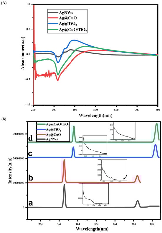 The surface plasmon resonance (SPR) phenomenon was demonstrated by the metal nanostructures including the Ag NWs, Ag@CuO, Ag@TiO2, and Ag@CuO/TiO2 nanodesigns, as expressed in Figure 4A. The whole prepared sample was concentrated in ethanol within 5 mL, and just one drop was taken in the cuvette and diluted with ethanol to the level of its cap to record the UV–Vis observation. Figure 4 shows a typical view of Ag NWs comprising its transverse and longitudinal growth. The longitudinal mode exhibited a SPR at 393 nm, while the transverse pattern showed a SPR at 357 nm. The shoulder peak at 357 nm and the peak at 393 nm were attributed to the out-of-plane quadrupole resonance and the out-of-plane dipole resonance of the Ag NWs, respectively [34]. These nanowires either had a lower plasmon concentration or moved away from the UV–Vis radiation scan after being subjected to surface coating, and the SPR bands decreased because they were less sweeping. This effect was observed for the Ag@CuO nanocables, which shows that when Ag NWs are coated with CuO, the SPR results decrease. The transverse SPR of the Ag NWs at 357 nm was suppressed, a result consistent with CuO deposited on the surface of wires [35]. A broader peak for the TiO2 coating appeared in the Ag@TiO2, but the possibility of Ag SPR was similarly decreased. Moreover, a similar impact with a slight red shift was observed for the Ag@CuO/TiO2 nanohybrid, as shown in Figure 4A. These results prove that the SPR is a surface property of metal nanostructures; in the case of Ag, this phenomenon was quite strong. Metal oxides like CuO and TiO2 did not have this property, but their coating did not affect the intrinsic SPR of metal, however, the coating decreased the innate intensity.